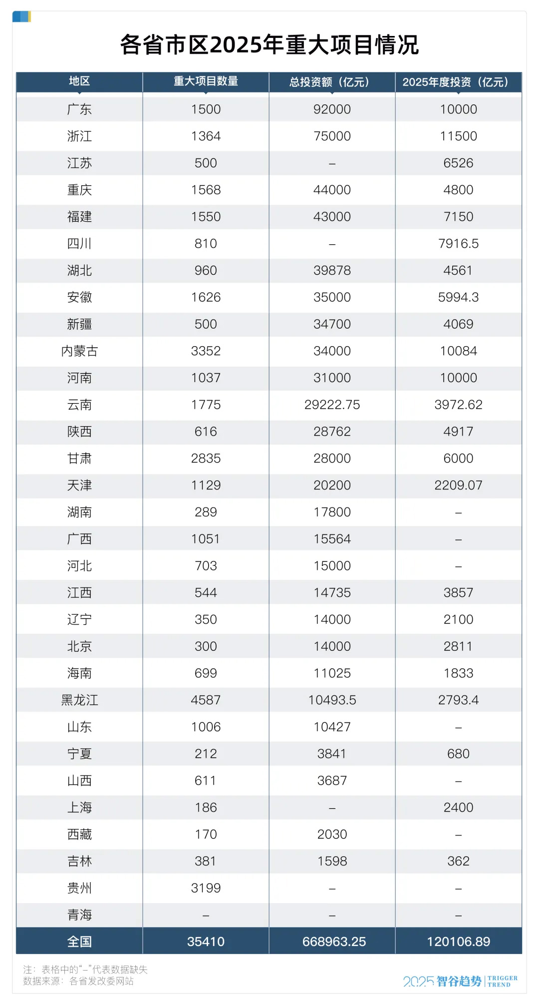 万万没想到,今年居然是基建大年。智谷趋势统计发现,全国各省份(除港澳台及青海外)已公布的年度重大项目清单,总量高达约35410个,规模远超往年。这些项目堪称“吞金巨兽”,已披露总投资额至少达到67万亿元左右。请注意“至少”——因为上海、贵州、四川和江苏四地未公布投资额,实际总额可能更高。