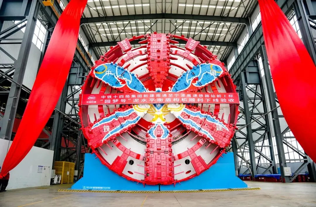 科技腾飞, 智慧基建赋能交通网络建设, 从此四海皆通途。 2024年4月18日, 随着开挖直径达14.81米的 泥水平衡盾构机 ——“通甬园梦号”刀盘转动, 通甬高铁苏州东隧道工程 开始盾构掘进, 盾构推拼同步成套智能掘进技术 实现示范应用。
